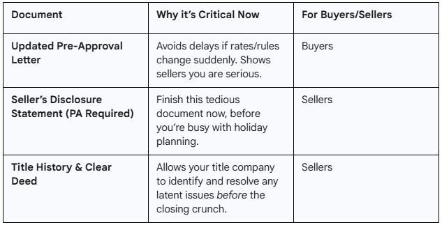 - Be Ready to Close: Have your pre-approval letter updated, your inspection team lined up, and your closing funds ready. Being the "sure thing" in a seller’s eyes during the busy holiday season is a huge advantage.